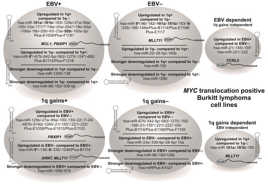 One of the mechanisms used to control gene expression includes post-transcriptional regulation by miRNAs. Expression of miRNAs in BL was investigated in different experimental approaches. However, a relation to EBV and 1q gains has not yet been reported. Here, we investigated miRNA expression in MYC-Ig translocation-positive BL-CLs and observed 64 miRNAs that were EBV- and 1q-gains-dependent dysregulated in BL-CLs: 21 of them were known to be dysregulated in BL, 10 miRNAs were not delineated yet and the remaining 33, were described for the first time in this paper to be dysregulated in BL. However, these 33 miRNAs were found to be dysregulated in other cancer entities (s. references in Supplemental Table S5).