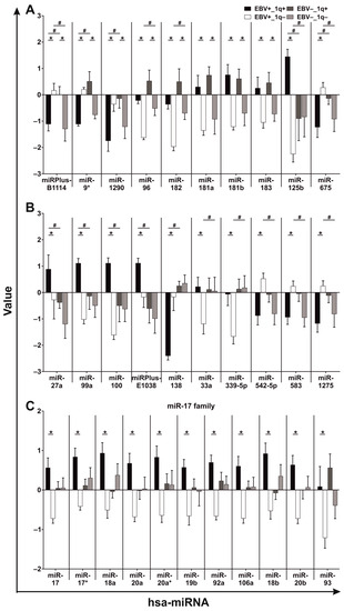 It is also noteworthy that 5 of the 64 significantly dysregulated miRNAs were localized on the long arm of chromosome 1, namely hsa-miR-181a and hsa-miR-181b at 1q32.1, hsa-miR-9, hsa-miR-9* and hsa-miR-92b at 1q22, and all of them were upregulated in BL-CLs with 1q gains (Figure 4A,D, no. #6,#7,#2,#40,#33). While hsa-miR-92b was upregulated in EBV+ BL-CLs with 1q gains, hsa-miR-181a and hsa-miR-181b were both upregulated in EBV+ and EBV− BL-CLs with 1q gains. In contrast, hsa-miR-9 and hsa-miR-9* were upregulated in EBV− BL-CLs with 1q gains. Additionally, hsa-miR-9* was downregulated in EBV+ BL-CLs with 1q gains and upregulated in those without 1q gains (Figure 4A,D, no. #6,#7,#2,#40,#33, Supplemental Tables S3 and S4).