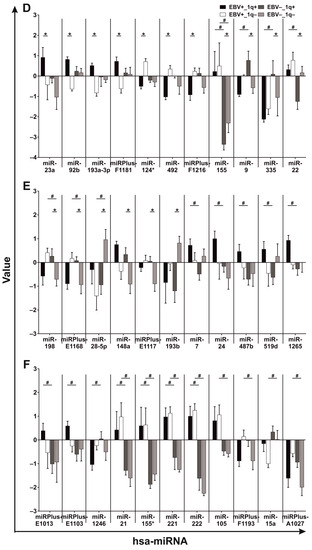 EBV- and 1q-gains-dependent miRNA expression in BL-CLs. Expression profiles of 64 significantly dysregulated miRNAs in BL-CLs depending on their EBV and 1q gain status are shown as diagrams (A–F). All miRNAs are numbered according to their appearance in this figure indicated under their names. Value: log2 normalized Hy3/Hy5 ratios. Statistical analysis: two-way ANOVA followed by Tukey’s multiple comparisons test, * indicates the comparison between the BL-CL groups with 1q gains (1q+) vs. without 1q gains (1q−) (p < 0.05) and # indicates the comparison between the BL-CL groups EBV-positive (EBV+) vs. EBV-negative (EBV−) (p < 0.05).