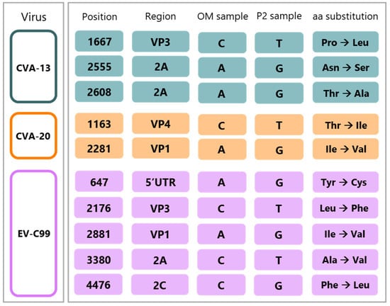 Mutations acquired by CVA-13, CVA-20, and EV-C99 after two passages on Caco2 cells. For each mutation, the nucleotide position, the region of the genome, the nucleotide in the OM sample, the nucleotide in the P2 sample, and the amino acid substitution are indicated. Green indicates CVA-13, orange indicates CVA-20, and pink indicates EV-C99. CVA-13 (Coxsackievirus 13), CVA-20 (Coxsackievirus 20), EV-C99 (Enterovirus C 99), OM sample (original fecal sample), P2 (passage 2), aa (amino acid), 5′UTR (5′ untranslated region), VP3 (capsid protein 3), 2A (2A protease), VP4 (capsid protein 4), VP1 (capsid protein 1), 2C (2C protein), G (guanine), A (adenosine), C (cytosine), T (thymine).