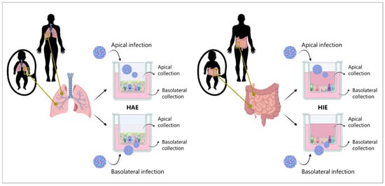 Schematic representation of the experimental layout. Airway and intestinal tissues are isolated from both fetal and adult donors. Monolayers of each tissue and each donor are then generated. Infection is performed both apically and basolaterally and supernatant is collected at specified time points from both compartments. HAE (human airway epithelium), HIE (human intestinal epithelium).