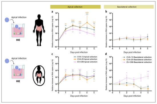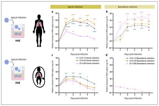MucilAir™ adult HAE cultures from a pool of 14 donors were infected in duplicates while all the other cultures from the three donors each were infected in triplicates. The multiplicity of infection (MOI) was calculated based on the average number of cells/HAE insert (5 × 105) or cells/HIE insert (2 × 105) and used for the infection of both the fetal and adult HAE and HIE cultures. After washing the apical compartment with 100 µL of the medium to remove the excess mucus, the HAE and HIE inserts were infected by adding 50 µL of CVA-13, CVA-20, or EV-C99 (MOI = 0.02) to the apical side or 50 µL to the basolateral side together with 450 µL of the medium. Infected HAE and HIE were incubated at 37 °C with 5% CO2 for 2 h. After incubation, monolayers were washed three times with Advanced DMEM/F12 on both sides. Fresh medium was added to the apical (100 µL) and basolateral compartment (500 µL), and the cultures were incubated at 37 °C with 5% CO2 for 10 min. After ten minutes, 100 µL of the medium from each compartment were collected for the first time point (0 h) and immediately replenished with fresh medium, allowing for the following time point collection except for the HAE cultures that were left at the ALI interface, and upon sampling, 100 µL of the medium was added to the apical compartment and collected after 10 min of incubation at 37 °C. Medium collection was carried out at 24, 48, 72, 96, and 120 h post-infection (hpi). Non-infected inserts in triplicates were included in the experiment as negative controls.