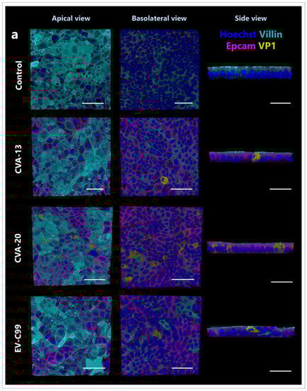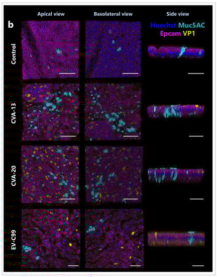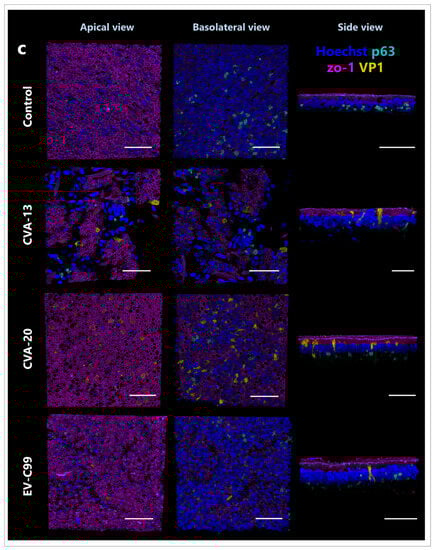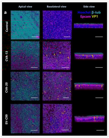 The HIE and HAE cultures used for immunostaining were apically infected with 100 µL of CVA-13 (TCID50/mL = 7.8), CVA-20 (TCID50/mL = 9.1), or EV-C99 (TCID50/mL = 5.5). Inserts were fixed 8 h post-infection with 4% (v/v) formaldehyde (Sigma-Aldrich, St. Louis, MO, USA) for 15 min at RT and stored in PBS at 4 °C. Transwells were then permeabilized with 100% ice-cold methanol (VWR Chemicals, Pennsylvania, USA) for 5 min at RT, followed by three washes with PBS. After permeabilization, the membrane was removed from the insert using a scalpel and placed on a glass slide with 200 µL of SEA BLOCK Blocking Buffer (Thermo Fisher Scientific, Waltham, MA, USA). Following overnight blocking at 4 °C, virus staining was performed by adding two drops of the pan-Enterovirus capsid protein VP1 mouse antibody (D3 Enterovirus Mab Reagent, 01-050000, Quidel, San Diego, CA, USA). After a 1 h incubation at 37 °C, the VP1 antibody was removed, and the membranes were incubated at 4 °C overnight with 100 µL of the primary antibodies diluted in SEA BLOCK Blocking Buffer (see Supplementary Table S1). Following incubation with the primary antibodies, the cultures were washed three times with 1% (v/v) Tween® 20 (Sigma-Aldrich, St. Louis, MO, USA) in Tris Buffered Saline (TBS) (Merck Millipore, Burlington, MA, USA). Membranes were then incubated with 100 µL of the secondary antibodies (see Supplementary Table S1) together with 10 µg/mL of Hoechst 33342 (Thermo Fisher Scientific, Waltham, MA, USA) for nuclei staining for 2 h at RT in the dark. Finally, membranes were mounted using ProLong™ Glass Antifade Mountant (Thermo Fisher Scientific, Waltham, USA), and the slides were imaged with a Leica TCS SP8-X microscope using an HC Plan Apochromat 63× oil objective. After a 0.4 µm thick Z-stacks acquisition, the images were processed with Leica LAS AF Software 4.0.11706 (Leica Microsystems, Wetzlar, Germany), and 3D reconstructions were performed using the LAS-X 3D Software 4.0.11706. At the same time, non-infected membranes were stained as negative controls. Additionally, to ensure the specificity of antibody binding, incubation with secondary antibodies only was also performed.