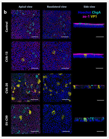 3.5. CVA-13 and CVA-20 Infect Enterocytes While EV-C99 Infects Both Enterocytes and Enteroendocrine Cells