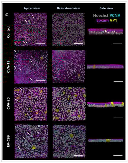 Immunofluorescence images of HIE infected with CVA-13, CVA-20, and EV-C99. Three-dimensional confocal images from an apical, basolateral, and side view at 8 h post-infection for all viruses. (a) Enterocytes are stained for villin (cyan), nuclei are stained with Hoechst 33342 (blue), cell boundaries are visualized by staining for Epcam (magenta), and viruses are stained for capsid protein VP1 (yellow). (b) Enteroendocrine cells are stained for ChgA (cyan), nuclei are stained with Hoechst 33342 (blue), tight junctions are stained for zo-1 (magenta), and viruses are stained for capsid protein VP1 (yellow). (c) Proliferating cells are stained for PCNA (cyan), nuclei are stained with Hoechst 33342 (grey), cell boundaries are visualized using Epcam (magenta), and viruses are stained for capsid protein VP1 (yellow). Arrows indicate some PCNA positive cells. The scale bar is 50 µm.
