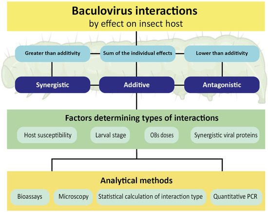 Research on the in vivo co-infection of baculoviruses aims to improve their use as biopesticides. Most interaction studies have focused on mixtures of an NPV and a GV isolated from the same host species. Also, artificial baculovirus combinations have been assayed using an NPV mixed with a GV that is not infective for the host. In this study, we critically review the literature in this field and propose a classification of virus interaction based on its effect on the host. Moreover, we describe the factors that determine the type of interaction and the techniques involved in the mixed infection analysis. A schematic representation of the topics discussed here is presented in Figure 1.