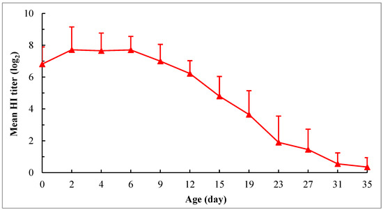 The objective of this experiment was to determine the decaying pattern of maternally derived HI antibodies against NDV. Fifty newly hatched chicks from the breeder flock at 22 weeks of age were reared for 35 days maintaining all the hygienic measures in an isolated and environmentally controlled room. Commercial feed and water were supplied ad libitum. The chicks were not vaccinated, and no medication was administered during the experiment period. Beginning at hatching, 20 birds were randomly selected and bled for serological detection at different intervals varying from 2 to 4 days up to 35 days of age. The birds were bled via the jugular vein before 6 days of age and via the wing vein thereafter. Serum samples were stored at −20 °C until analysis. At the end of the experiment, sera samples from chicks were detected simultaneously for HI antibody levels by HI test.
