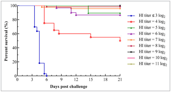 Survival curve of chicks with different levels of maternally derived HI antibodies following challenge with virulent genotype VII NDV strain JSC0804. The chicks were hatched from the hens at 25 weeks of age. The hens were vaccinated at 1 and 4 weeks using the combined live attenuated vaccine against ND and infectious bronchitis (VG/GA strain + H120 strain) (intraocularly and intranasally) and at 5 and 15 weeks using the inactivated recombinant NDV vaccine (A-VII strain, genotype VII) (intramuscularly). Each chick was challenged with 106 ELD50 JSC0804 strain intraocularly and intranasally and the survival status was monitored twice daily for 21 days.
