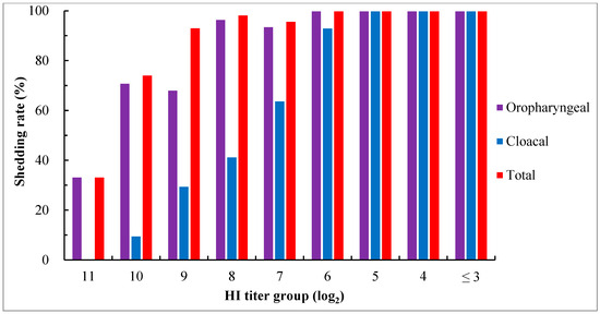 Virus shedding in chicks with different levels of maternally derived HI antibodies at day 5 after the challenge with virulent genotype VII NDV strain JSC0804. Viruses in swabs were detected via virus isolation using 9- to 10-day-old SPF embryos. Oropharyngeal shedding rate = the number of birds positive in virus isolation from oropharyngeal swabs/the number of surviving birds × 100%; cloacal shedding rate = the number of birds positive in virus isolation from cloacal swabs/the number of surviving birds × 100%; total shedding rate = the number of birds positive in virus isolation from oropharyngeal or cloacal or both swabs/the number of surviving birds × 100%.
