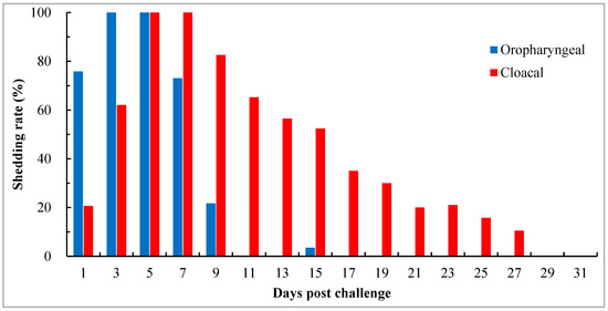 To assess virus shedding after the challenge, for groups with the HI titers of 4 log2 and 5 log2, beginning on the first day after the challenge, oropharyngeal and cloacal swabs were taken from each surviving bird every 2 days until 31 days pc for virus isolation, while swabs were taken only at 5 days pc for other groups. Swabs were placed in Eppendorf tubes containing 0.75 mL PBS (0.01 mol/L, pH 7.4). At 15 days pc, all surviving birds were bled for serological testing. The swab and serum samples were stored at −20 °C and the tissue samples at −80 °C until further use.