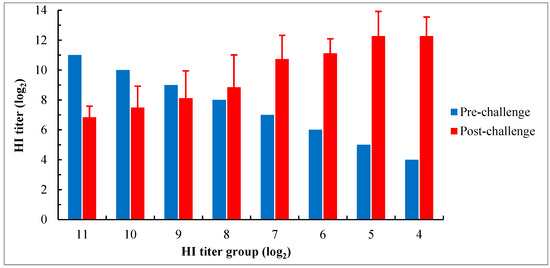 Except for the group with the HI titer ≤ 3 log2 in which all birds died 6 days pc, serum samples were collected from all surviving birds in other groups at 15 days pc for examination of serological responses using the HI test with the genotype VII NDV antigen. The results showed that the mean HI antibody titers in groups with titers ranging from 4 log2 to 8 log2 increased to varying degrees after the challenge compared to their titers before the challenge, and the magnitude of increase was gradually decreased with an increase in titer before the challenge. However, in groups with titers ≥ 9 log2, the mean titers after the challenge were lower than their titers before the challenge, even though the virus shedding was also detected in these groups. Moreover, in groups with titers ranging from 8 log2 to 10 log2, the coefficient of variance (CV) values of HI titer after the challenge were more than 15% (19.2% to 24.5%), which were higher than the values observed in other groups. It was the highest in the group with a titer of 8 log2, reaching 24.5% (Figure 5).