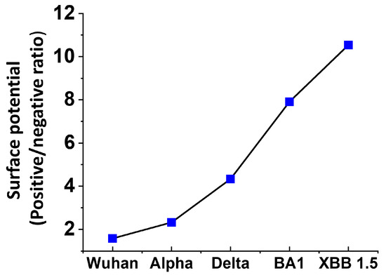 Electrostatic surface potential of representative SARS-CoV-2 variants (calculated on the spike trimer surface facing the host cells by integration of the positive (blue) and negative (red) areas and expressed as the positive/negative ratio (values from ref. [25]), completed with the value obtained for Omicron XBB 1.5 calculated with the same method for the present article).