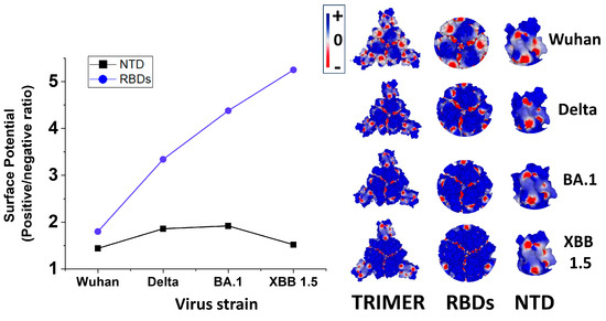 According to these data, the electrostatic surface potential of the spike protein appears to be totally independent of its hydrogen bond forming capacity. The evolution of the surface potential of trimeric spikes has been compared among SARS-CoV-2 variants from the original Wuhan strain to Omicron BA.1 [92]. It appeared that the surface potential changes do not concern the whole surface but preferentially the central areas which correspond to the masked receptor binding domains (RBD) in the prefusion conformation. The data of Figure 4 and Figure 5 perfectly reflect this phenomenon, since the gradual increase of the surface potential is chiefly due to the RBD. In contrast, the N-terminal domain (NTD) has a distinctive mode of evolution: regular increase of the surface potential from Wuhan to Delta [25,93], then stabilization between Delta and Omicron BA.1 [86], and finally, a decrease between BA.1 and XBB 1.5, the dominant variant in the summer of 2023 [94] (Figure 5). As discussed above, this discrepancy emphasizes a dual property of Omicron: stabilization of the surface potential in the NTD, but strong increase in the RBD so that globally, the trimeric spike of Omicron is significantly more positive than Delta [92].