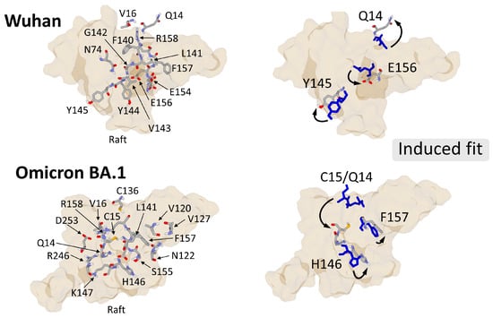 The induced fit mechanism that controls the functional interaction of the NTD of a given variant with raft gangliosides can be visualized by molecular modeling approaches (Figure 6). As discussed above, the conformational changes that optimize the binding of the NTD to the raft concerns both the gangliosides and key amino acid residues of the NTD [111]. For example, we can highlight a 180° reversal of the aromatic ring of tyrosine Y145 (Figure 6, upper right panel). In the case of Omicron BA.1, the conformational rearrangement implies a greater movement of the peptide chain, which can be visualized by the displacement of residues Q14 and C15 (Figure 6, lower right panel). Other adjustments are obtained by a reorientation of the side chain of residues such as Q14 and E156 (Wuhan NTD) or H146 and F157 (Omicron BA.1 NTD).