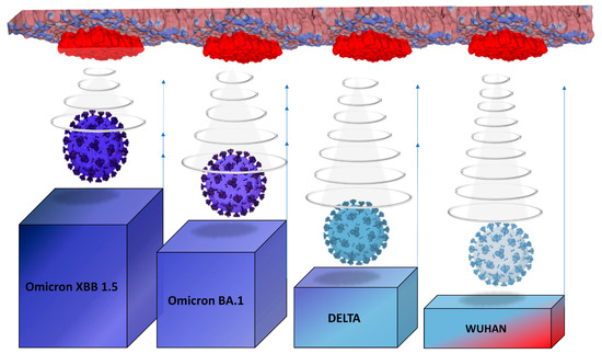 The analysis of the surface potential of the successive variants of SARS-CoV-2 perfectly illustrates the peremptory nature of this selection pressure. As shown in Figure 4, there is a gradual increase in the electrostatic potential of the spike protein trimers [25] which, after three years of evolution, has been multiplied by 6.7 between the initial strain from Wuhan and the latest circulating variants in the summer of 2023, Omicron XBB 1.5 (Table 1). This evolution of the surface electrostatic potential is not only due to the accumulation of mutations in both the NTD and the RBD [25,79,80,81] but also to deletions in the NTD [25,82,83]. Among the mutations that increase the surface potential, one can cite E484K [84], which induces the simultaneous loss of a negative charge with a gain of a cationic charge [85]. Deletions in the NTD condense the electropositive areas, which may allow a faster access to lipid rafts [25].