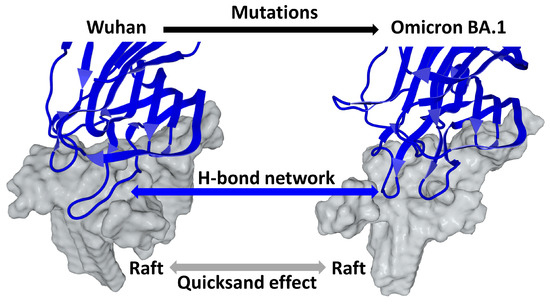 The establishment of this network of hydrogen bonds requires an adaptation of the raft which appears to play an active role in the formation of the virus-cell complex. It is therefore essential that the raft is not a rigid structure but on the contrary, a malleable entity capable of offering the hydrogen bond-forming residues of the NTD many possibilities to reach the donor or acceptor atoms and form high energy hydrogen bonds. This conformational plasticity of lipid rafts has been shown by molecular modeling in the case of amyloid proteins [49]. Our team also highlighted it for viruses, as explained in Figure 8. This illustration brings together three distinct phenomena that describe the impact of fine-tuning in the selection of viruses: (i) the appearance of mutations that generate variants; (ii) the compatibility of these mutations with the formation of a hydrogen bonding network stabilizing the virus-cell complex, and (iii) the quicksand effect which accounts for the exceptional conformational plasticity of the raft which can accommodate highly mutated viruses.