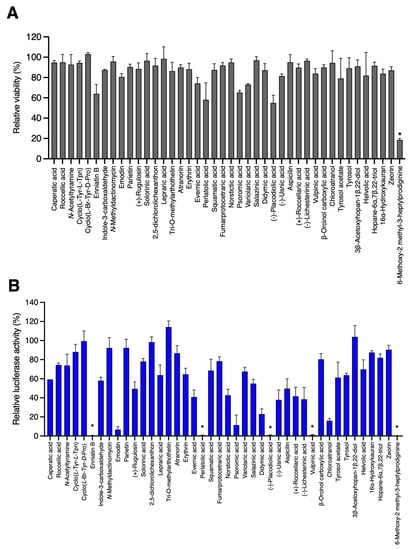 In order to identify new antiviral compounds against HCoVs and broaden the chemical structure diversity, 42 compounds isolated from lichens or their associated bacteria and fungi (Table 1) were tested against HCoV-229E-Luc. All the compounds were previously described in the literature (listed in Table 1) and were characterized using NMR spectroscopy and HR-MS. Huh-7 cells transduced with a lentiviral vector expressing the TMPRSS2 protease gene were used to mimic the in vivo entry pathway. In parallel, the toxicity of these compounds in Huh-7 cells was assessed using an MTS assay at 24 h. The toxicity and antiviral activity of each compound were tested at 25 μg/mL, and the results are presented in Figure 1.
