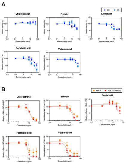 Of the 42 lichen-associated compounds that were tested for their activity against HCoV-229E infection in Huh-7/TMPRSS2, only four had a clear antiviral activity. However, the antiviral activity of enniatin B, isolated from an endolichenic fungus Fusarium avenaceum could not be validated in dose–response experiments after the first screen. This compound has already been described as cytotoxic towards several cancer cell lines [51].