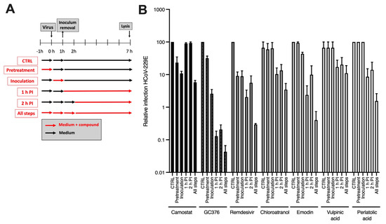 Time-of-addition assay. (A) Schematic representation of the experiment. (B) Lichen molecules (140 μM chloroatranol, 120 μM emodin, 40 μM vulpinic acid and 40 μM perlatolic acid) and controls (50 μM camostat, 50 μM GC376 and 200 nM remdesivir) were added at different time points during infection of Huh-7/TMPRSS2 cells by HCoV-229E-Luc, either 1 h before inoculation (pre-treatment), during inoculation for 1 h (inoculation), 1 h post-inoculation for 6 h (1 h PI), 2 h post-inoculation for 5 h (2 h PI), or during all the steps (All steps). Cells were lysed 7 h post-inoculation and luciferase activity was quantified. Results are the mean ± SEM of 3 experiments performed in triplicate.