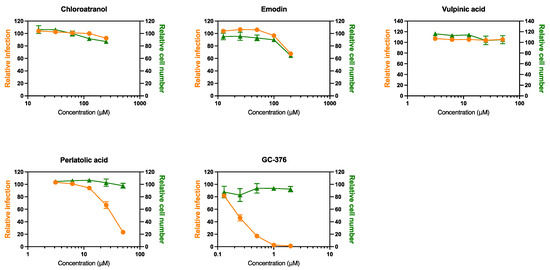 Due to their interesting effects on HCoV-229E, these molecules were further investigated for their potential pan-coronavirus activity. Therefore, the antiviral activity of chloroatranol, emodin, perlatolic acid and vulpinic acid were tested against SARS-CoV-2 in Vero-81-derived F1G-red cells [32]. The protease inhibitor GC376 was added as a control. As shown in Figure 4, chloroatranol and vulpinic acid were not active. Emodin seemed toxic at the highest concentration tested (200 μM); therefore, the antiviral activity observed was more likely due to toxicity. The only active compound against SARS-CoV-2 was perlatolic acid, which exerted a dose-dependent inhibition of infection without toxicity, with an IC50 value of 31.9 μM. As expected, GC376 was active against SARS-CoV-2, with an IC50 value of 0.22 μM.