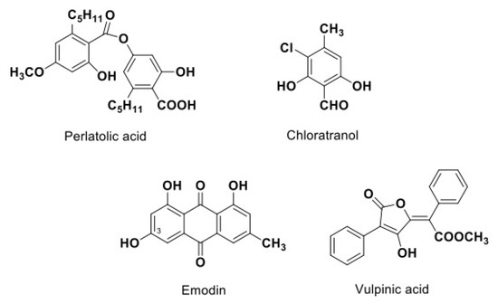 The results showed that perlatolic acid and vulpinic acid were the most active, as they had the lowest IC50 values (16.42 ± 1.66 μM and 14.58 ± 5.55 μM, respectively). Moreover, vulpinic acid displayed a higher SI than perlatolic acid. For emodin and chloroatranol, the CC50 and SI values could not be calculated because the CC50 was higher than the tested concentrations.
