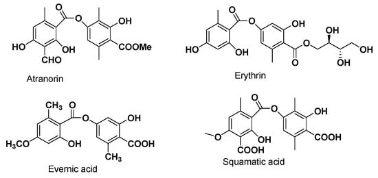 - Oettl, S.K.; Gerstmeier, J.; Khan, S.Y.; Wiechmann, K.; Bauer, J.; Atanasov, A.G.; Malainer, C.; Awad, E.M.; Uhrin, P.; Heiss, E.H.; et al. Imbricaric acid and perlatolic acid: Multi-targeting anti-inflammatory depsides from Cetrelia monachorum. PLoS ONE 2013, 8, e76929. [Google Scholar] [CrossRef]