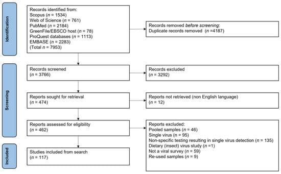 A search strategy involving six individual searches from eight databases (Supplementary File S1) was performed on the 2 December 2021. Search strings incorporating synonyms from three key concepts, “bat”, “viral”, and “co-infection”, were tailored to each database format, and where the interface allowed, were further targeted using the following subject terms: bat, Chiroptera, virus, virology, infection, or infectious disease. All results were exported to EndNote 20.6 Build 17174 (Philadelphia, PA, USA) [23] reference management software and duplicates were removed before initial screening.