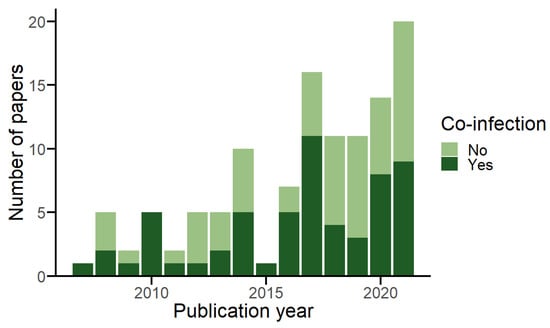 Publication of multi-viral studies in bats over time, showing the number of papers across the full database, grouped by whether co-infection was detected or not.