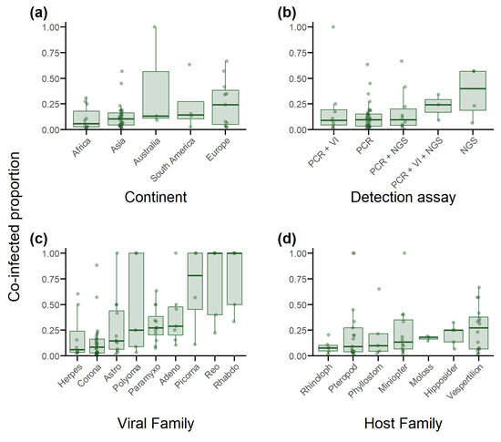 Boxplots depicting the median co-infected proportion and interquartile range described by the 25th and 75th percentiles of all studies in the database that detected co-infection, stratified by the continent the bats were sampled from, the viral detection strategy used (PCR, viral isolation (VI) or next-generation sequencing (NGS)), and the individual viral and host family. Co-infected proportion represents the proportion of positive individuals from each stratum that were co-infected. (a) Sampling location (continent). (b) Detection assays used. (c) Viral family. (d) Host family.