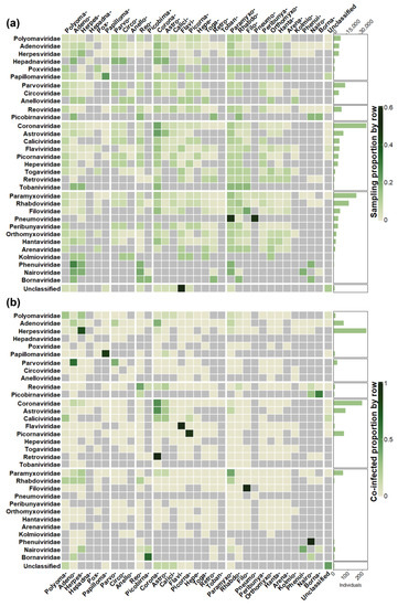 Heat map displaying the screening effort and detection of each pairwise host and viral family combination recorded in the database. The bar chart on the right displays the number of individual bats tested or infected from each host family for each row. The heat map then displays the proportion of those individuals tested or co-infected with the viral family on each column. Values used to generate the plot are from Tables S5 and S6. (a) Screening effort. (b) Co-infections detected. Grey cells are combinations not tested for. Columns and rows are grouped by virus genome structure. The same viral families, in abbreviated form, are present in Figure 5.