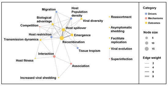 Almost a quarter of publications detecting co-infection make no specific reference to that co-infection within the text (n = 13). Of the remaining papers that do use specific terminology to report co-infection, few mention it in the abstract (n = 15; 33%), or title and keywords (n = 4; 9%). Twelve unique expressions were used to describe co-infection, with co-infection (53%) and coinfection (29%) being the most frequently used (Table S1). Twenty-five papers (43%) discuss co-infection in the broader context of viral ecology and epidemiology. Eighteen themes of discussion were identified and grouped within three broad categories: those conditions required or likely to promote co-infection (termed Drivers), the consequences of viral co-infection (termed Outcomes), and the mechanisms occurring between co-infecting viruses (termed Mechanisms). Outcomes of co-infection dominated the discussion, with recombination (n = 15), host spillover (n = 9), and emergence (n = 6) the most commonly occurring and most frequently discussed together within the network graph (Figure 7). Host population density and host restriction (n = 3) were the most frequently mentioned input themes. Interaction (n = 4) was the mechanism theme most discussed and was used in the context of impacting recombination, shedding, transmission dynamics, and host fitness (Figure 7).