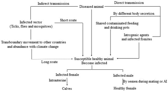Direct contact with infected animals has been shown to be an effective method of LSDV transmission [66,67] since they shed the virus through skin lesions, nasal, oral and ocular secretions, and from lesions containing mucosa [68]. Direct transmission of this disease then occurs through the introduction of shared feeding and watering pots contaminated with these body secretions. It can also be transmitted iatrogenically during mass treatment using common treatment tools such as needles [6,55,69]. Lactating cows can also transmit LSDV to suckling calves by milk contaminated with udder skin lesions, while vertical transmission has been demonstrated experimentally through the transmission of infected semen during natural mating or artificial insemination; the virus may remain persistent for up to 42 days post-infection in semen [70]. An intrauterine route of infection was recorded as vertical transmission from dam to calves [68,71] and it is assumed that this virus can be shed through vaginal secretion [48,72]. Direct transmission accounts for short route infection, whereas indirect or vector borne transmission can be applicable for both short and long-distance infection followed by uncontrolled transboundary animal movement [45,73,74]. A representation of the possible mode of transmission of LSDV is shown in Figure 1.