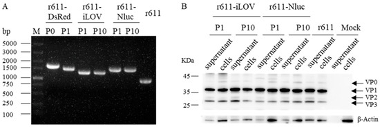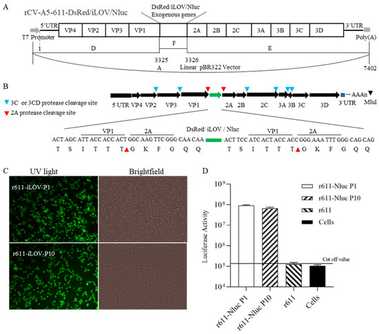 3.2. Construction and Rescue of the Recombinant CV-A5-611 Tagged with Reporter Genes