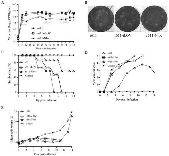 3.4. Propagation in Cells and Virulence of r611-Nluc and r611-iLOV in Mice