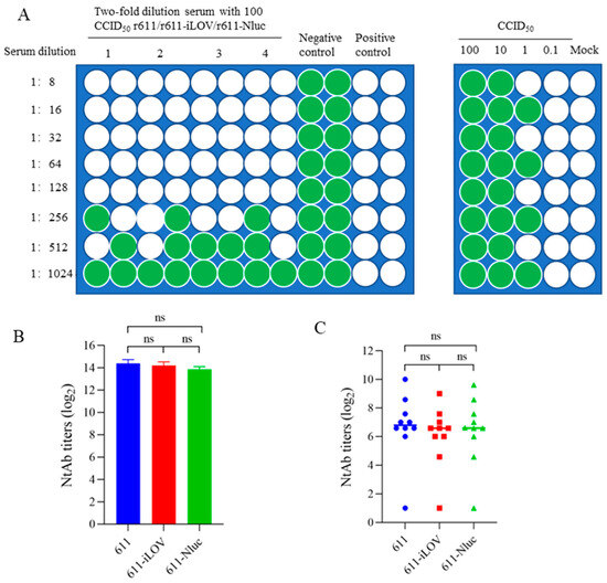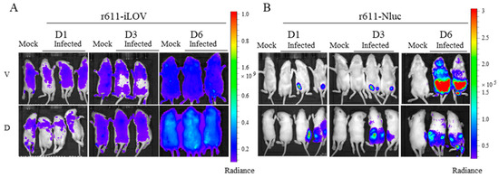2.8. Virulence of r611, r611-iLOV and r611-Nluc in Newborn Kunming Mice