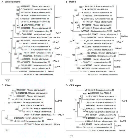 Phylogenetic analysis of (A) whole genome, (B) hexon, (C) fiber-1, and (D) CR1 genes of AdV-RBR-6-3 compared with reference sequences of Human adenovirus A to G (HAdV-A to -G), Simian adenovirus A (SAdV-A) and B (SAdV-B). Black triangle indicates AdV-RBR-6-3. Diamond indicates Human adenovirus 52, the only member of species HAdV-G isolated from human. Tree shrew adenovirus sequences were used as an outgroup for the whole genome and hexon trees. SAdV-A sequences were used as an outgroup for the fiber-1 and CR1 trees. According to variabilities in fiber and CR1 regions amongst mastadenoviruses, sequences with ≥30% identities were included in the trees. The trees were constructed using the maximum likelihood method with a bootstrap of 1000. Bootstrap values are shown at the node. The bar represents nucleotide substitutions per site.