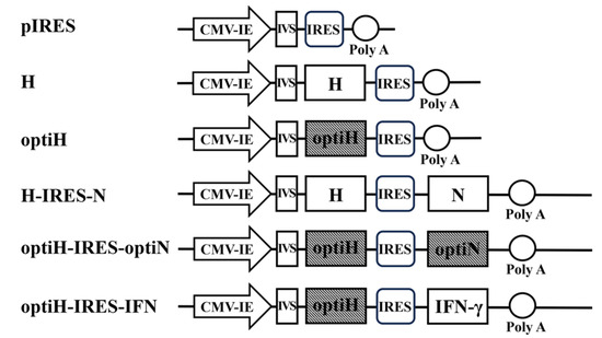 Restriction enzyme NotI sites were inserted at the 5′ ends and SalI at the 3′ ends of the cDNA encoding the N and IFN-γ genes. NheI sites were inserted at the 5′ ends and XhoI sites at the 3′ ends of the cDNA encoding the H gene. The target genes were sequentially cloned into the eukaryotic expression pIRES vector; then, five recombinant plasmids, pH-IRES (H), pH-IRES-N (H-IRES-N), poptiH-IRES (optiH), poptiH-IRES-optiN (optiH-IRES-optiN), and poptiH-IRES-IFN-γ (optiH-IRES-IFN), were constructed (Figure 1). The recombinant plasmids were purified using the Genopure Plasmid Midi Kit (Roche, Kaiseraugst 4303, Switzerland).
