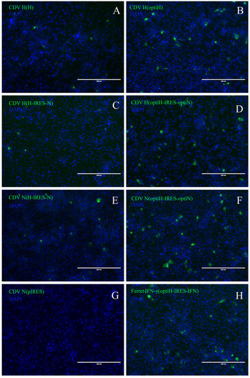 Antigen expression was detected using indirect immunofluorescence. The BHK-21 cells were transfected with one of the recombinant plasmids (H, H-IRES-N, optiH, optiH-IRES-IFN, optiH-IRES-optiN, and pIRES). Indirect immunofluorescence was performed 48 h after plasmid transfection. Bar = 200 µm. H (A), optiH (B), H-IRES-N (C), and optiH-IRES-optiN (D) were detected using a monoclonal antibody against the CDV H protein (1C42H11). H-IRES-N (E), optiH-IRES-optiN (F), and pIRES (G) were detected using a mouse monoclonal antibody against CDV-NP. optiH-IRES-IFN (H) was detected using monoclonal antibodies against mink IFN-γ.