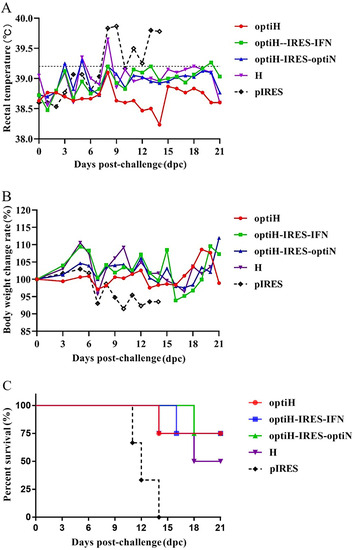 Clinical symptoms and disease course after challenge. (A) Rectal temperature after challenge with 5804Pe/H after immunization with different recombinant plasmids. Temperatures were recorded daily. The dashed line indicates the temperature considered to be febrile (39.2 °C). (B) Daily changes in body weight after the challenge. (C) Kaplan–Meier survival analysis after challenge.