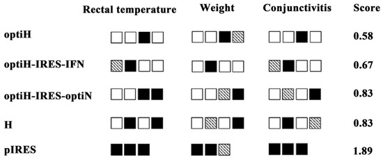 Furthermore, a clinical symptom scoring system was established to score and evaluate the immunized effects of different vaccine groups (Figure 7). Immune group optiH showed the lowest score (0.58), followed by the optiH-IRES-IFN (0.67), optiH-IRES-optiN (0.83), and H groups (0.83), while the control group showed the highest score (1.89). The results of clinical symptom scoring agreed with the anti-CDV NAb responses after DNA vaccine immunization, suggesting that DNA vaccine immunization reduced the severity of clinical symptoms in infected animals.