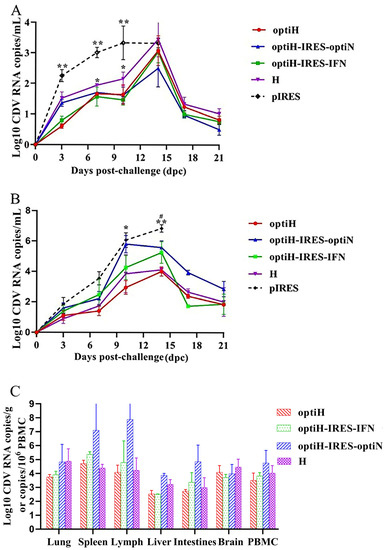 CDV RNA loads in the nasal and rectal swabs and tissues of infected animals using real-time RT-PCR. Both the nasal (A) and rectal swabs (B) were collected from infected ferrets at various time points. The results show the mean values ± SEM of four ferrets at different time points after the CDV challenge. (C) Six tissue types and PBMC were collected and analyzed for CDV RNA loads from infected animals at 21 dpc. The results are presented as mean ± SEM. (* p < 0.05, ** p < 0.01, compared with the control group; # p < 0.05, compared with H).