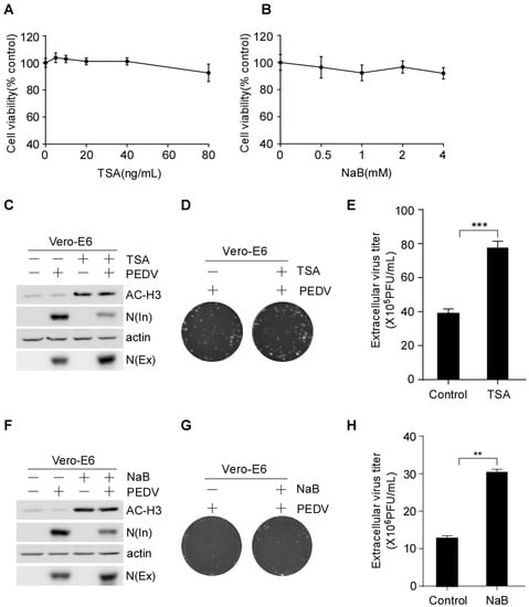 HDAC inhibitors, such as TSA and SAHA, suppress HCV and RSV replication [38,39,40], whereas romidepsin inhibits the entry of SARS-CoV-2 [41]. This finding prompted us to investigate whether HDAC inhibitors regulate PEDV infection. To verify this possibility, Vero-E6 cells were pretreated with or without TSA and NaB, inhibitors of class I and II HDACs [43,44], and then infected with PEDV. The culture medium and the infected cells were harvested separately. To test the cytotoxicity of the HDAC-specific inhibitors we performed CCK-8 assay. We found that the HDAC-specific inhibitors at concentrations used in this study did not affect the cell viability (Figure 1A,B). To determine the functionality of HDAC-specific inhibitors, the infected cell lysates were analyzed via Western blotting analysis of acetylated histone H3. The protein level of acetylated histone H3 was increased by the HDAC-specific inhibitors treatment (Figure 1C,F). The infected cell lysates and the culture medium were subjected to Western blotting to analyze the intracellular and extracellular PEDV N protein levels. We found that the HDAC-specific inhibitors decreased the intracellular PEDV-N protein levels but increased the extracellular PEDV-N protein levels (Figure 1C,F and Figure S1). Cells treated with TSA secreted about 2.0-fold higher levels of infectious virus particles in the supernatant than the DMSO-treated cells (Figure 1D,E). Cells treated with NaB secreted infectious virus particles in the supernatant about 2.3-fold higher than the control cells (Figure 1G,H). These data suggested that the HDAC-specific inhibitors facilitate the secretion of PEDV virus particles into the extracellular medium.