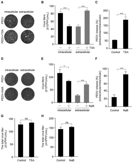 To further analyze the effect of HDAC-specific inhibitors on PEDV infection, Vero-E6 cells were pretreated with or without TSA and NaB and then infected with PEDV. The intracellular and extracellular virus titers were determined by plaque formation assay (PFU). PFU results showed that the HDAC-specific inhibitors treatment decreased the intracellular virus titer and increased the extracellular virus titer (Figure 2A,B,D,E). We used the ratio of virus titers in extracellular and intracellular compartments to evaluate virus release. The results showed that the TSA treatment resulted in an approximately 3.3-fold increase in the release of infectious virus particles (Figure 2C) compared with the approximately 2.7-fold increased by NaB treatment (Figure 2F). However, the total virus titer of HDAC-specific inhibitors-treated cells did not change significantly compared with the control (Figure 2G,H). These data indicated that the HDAC-specific inhibitors promote PEDV release without affecting its assembly.