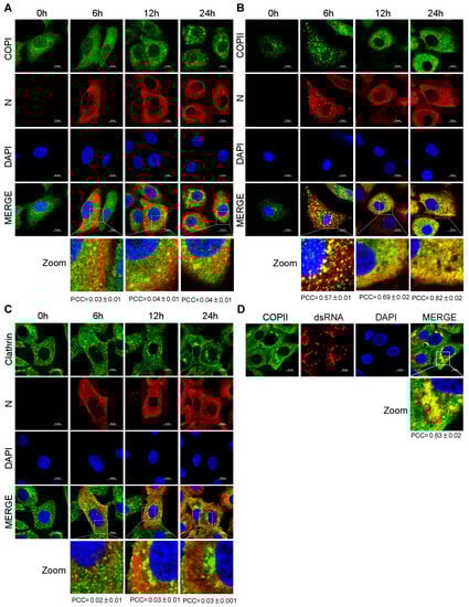 It has been reported that PEDV utilizes smooth-walled vesicles to egress [14]. Previous studies have shown that intracellular trafficking vesicles in eukaryotic cells are mainly composed of COPI, COPII and CCVs [17,18]. To determine the vesicular transport involved in PEDV transport, Vero-E6 cells were infected with PEDV. At different time points, Vero-E6 cells were stained with anti-Sec21p (γ subunit of COPI), anti-COPII and anti-clathrin antibodies to detect transport vesicles. The subcellular localization of PEDV N protein and trafficking vesicle markers was examined using a confocal microscopy. The confocal microscopic images showed that only COPII colocalized with PEDV N protein and the PEDV infection enhanced the colocalization of COPII and PEDV N in a time-dependent manner (Figure 3B). Neither COPI nor clathrin colocalized with PEDV N protein at the indicated time points (Figure 3A,C). Vero-E6 cells were also stained with anti-dsRNA antibody to detect the virus replication complex. We found that COPII colocalized with PEDV replicative intermediate dsRNA (Figure 3D). These findings suggested that COPII-coated vesicles mediate PEDV trafficking.