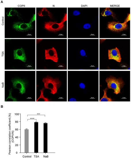Our study showed that the HDAC-specific inhibitors facilitated PEDV release (Figure 1, Figure 2 and Figure S1) and COPII was colocalized with the PEDV N protein (Figure 3). To determine whether HDAC-specific inhibitors promote the colocalization of COPII and PEDV N protein, Vero-E6 cells were infected with PEDV with or without TSA or NaB treatment. Vero-E6 cells were stained with anti-COPII antibody to identify transport vesicles. The colocalization of COPII and PEDV N was analyzed with confocal microscopy. PCC values showed that the colocalization of COPII and PEDV N protein was enhanced by HDAC-specific inhibitors (Figure 4A,B). These findings indicated that the HDAC-specific inhibitors promote PEDV N proteins capture into the COPII-coated vesicles. Immunofluorescence showed that the HDAC-specific inhibitors reduced PEDV N protein levels (Figure S2).