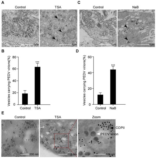 To establish the PEDV secretion induced by HDAC-specific inhibitors, we analyzed the inhibitory effect on PEDV compartmentation using TEM. Vero-E6 cells were infected with PEDV and treated with or without TSA or NaB. The PEDV virus particles were detected by TEM. As expected, it was found that PEDV virions mainly accumulate in ER-like luminal structures in control cells. In contrast, PEDV virions in the HDAC-specific inhibitors-treated cells were mainly enclosed within transport vesicles; the arrows indicate that some transport vesicles containing only one virion and others containing multiple virions (Figure 5A–D). These findings suggested that the HDAC-specific inhibitors promote the secretion of transport vesicles containing PEDV virions. In order to verify whether the transport vesicles were COPII-coated vesicles, we performed IEM to analyze the COPII-coated vesicles for PEDV virions. PEDV was found to be enclosed within COPII-coated vesicles (Figure 5E). The data showed that the HDAC-specific inhibitors promote the secretion of COPII-coated vesicles carrying PEDV virions.