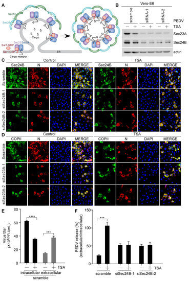 The COPII complex consists of five subunits: Sar1, Sec23, Sec24, Sec13 and Sec31 [23]. Sec23 acts as a GAP for Sar1. Sec24 is a primary subunit of the COPII-coated vesicles, which is responsible for the transportation of cargos from the ER to the Golgi apparatus [23,45,46]. A schematic diagram of the COPII-coated vesicles formation is presented in Figure 6A. To further establish the correlation between the COPII-coated vesicles and virus release, we disrupted the formation of the COPII-coated vesicles by knocking down Sec23A or Sec24B. Vero-E6 cells were transfected with Sec23A or Sec24B small interfering RNA (siRNA), followed by infection with PEDV with or without TSA treatment. The endogenous levels of Sec23A and Sec24B were significantly decreased in cells treated with Sec23A/Sec24B-specific siRNA compared with cells transfected with nontargeting scrambled siRNA (Figure 6B). Immunofluorescence showed that TSA reduced the PEDV N level in the cells transfected with non-targeting siRNA. However, TSA treatment had no significant effect on PEDV N levels in cells treated with Sec23A or Sec24B-specific siRNA (Figure 6C,D). The PFU data showed that TSA decreased the intracellular virus titer and increased the extracellular virus titer in cells with non-targeting siRNA transfected cells (Figure 6E). PEDV release was evaluated using the ratio of extracellular-to-intracellular virus titers. We found that PEDV release by TSA was inhibited in cells with Sec24B knockdown cells (Figure 6F). The above results indicated that Sec24B-containing COPII-coated vesicles are essential for PEDV release following HDAC-specific inhibitors treatment. Interestingly, we found that the decrease in PEDV N protein levels induced by HDAC-specific inhibitors leads to a decrease in Sec23A/Sec24B protein levels (Figure S3).