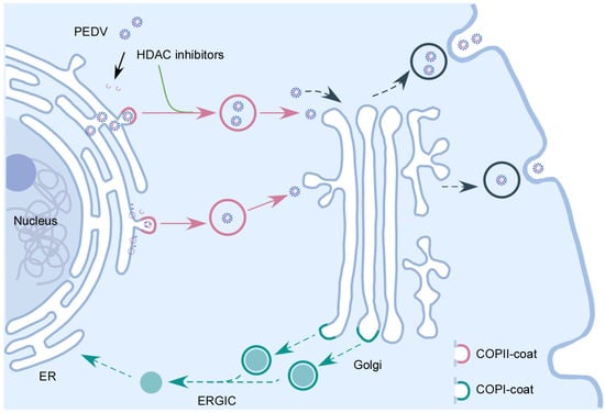The interplay between HDAC-specific inhibitors and COPII-coated vesicles during PEDV infection. Following the entry of PEDV into host cells and replication in the cytoplasm, the newly synthesized PEDV viral components and PEDV virus particles are transported to Golgi apparatus by the COPII-coated vesicles. HDAC-specific inhibitors facilitate PEDV release by promoting the secretion of COPII-coated vesicles carrying PEDV virions.