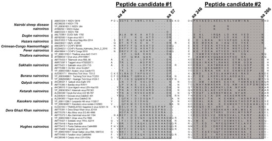 There are a limited number of sequences per species of orthonairoviruses in public depositories. The amino acid sequences of a few strains per species were directly collected or translated from a nucleotide sequence (Sapphire II virus, KU343165.1) obtained from GenBank (Table S1). The rationale was to find an amino acid sequence exclusive to NSDV among members of the same genus. Forty-three sequences from 12 species of orthonairoviruses were aligned, including Nairobi sheep disease, Dugbe, Hazara, Crimean–Congo haemorrhagic fever, Thiafora, Sakhalin, Burana, Qalyub, Ketarah, Kasokero, Dera Ghazi Khan, and Hughes nairoviruses. We focused on regions of low sequence homology, i.e., regions of particular interest presenting a lot of mismatches were retained (Figure 1). Overall, two peptide candidates were retained with peptide #1 SGYEVSMRLVSSES (SG…SES) displaying 93–100% identity among NSDV strains and <37% identity to all other Orthonairovirus species and peptide #2 PKVAEDLKESLKSLVAWINAH (PR…NAH) displaying 86–100% identity among NSDV strains and <34% identity to all other Orthonairovirus species. The closest relative for both peptides was Kupe virus (36% and 33% identity to NSDV for peptide #1 and #2, respectively), a strain of the species Dugbe nairovirus. Percentages of identity to each species are presented in Table S2.