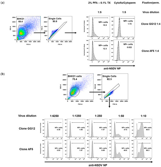 Flow cytometry analysis of NSDV-infected BHK cells. (a) PFA/Triton X100 (PFA—0.1% TX) and Cytofix/Cytoperm treatments result in poor staining for both monoclonal antibodies used at a high concentration (1:4) and at a high concentration of virus (dilution of 1:5). (b) Methanol fixation-permeabilisation allows for staining of NSDV-infected cells in a dose-dependent manner. Cells were infected with varying dilutions of virus (1:10 to 1:6250) and both antibodies were used at 1:50. For (a,b), the gating strategy is provided; dashed line in histograms represent NP staining of uninfected BHK cells while grey curve represents NP staining for BHK-infected cells.